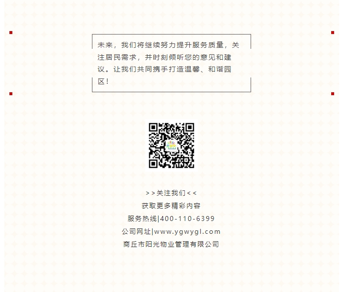 陽光物業(yè)成立于2003年5月,專注物業(yè)服務(wù)行業(yè)20余載,陽光物業(yè)現(xiàn)為河南省物業(yè)管理協(xié)會(huì)副會(huì)長單位、商丘市物業(yè)管理協(xié)會(huì)副會(huì)長單位,公司注冊(cè)資金1020萬元,陽光物業(yè)連續(xù)多年被河南省及商丘市評(píng)為先進(jìn)企業(yè)、優(yōu)秀企業(yè)。